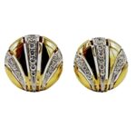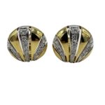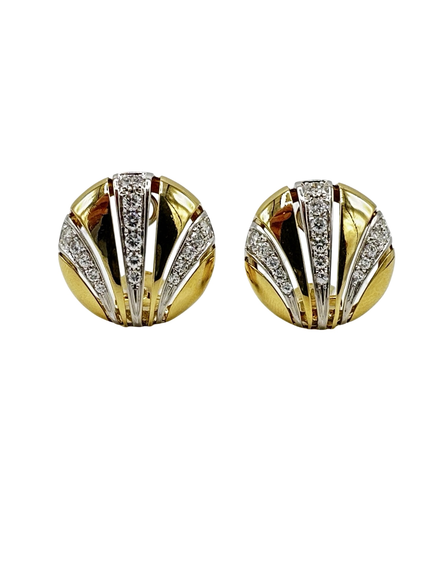 Classy and timeless ear clips created by Van Cleef & Arpels in the 1980s. Feminine, wearable and French chic, the earrings are a great addition to your jewelry collection. Made of 18 karat yellow and white gold and set with round brilliant cut diamonds (F-G color, VVS clarity, total weight approximately 1.66 carats). The earrings measure 7/8 inch (2.2 cm) in diameter and weight 19.1 grams. The earrings are clip-on, posts can be added. The earrings are stamped with Van Cleef & Arpels maker’s mark, hallmark for 18 karat gold.