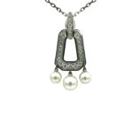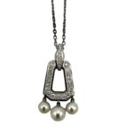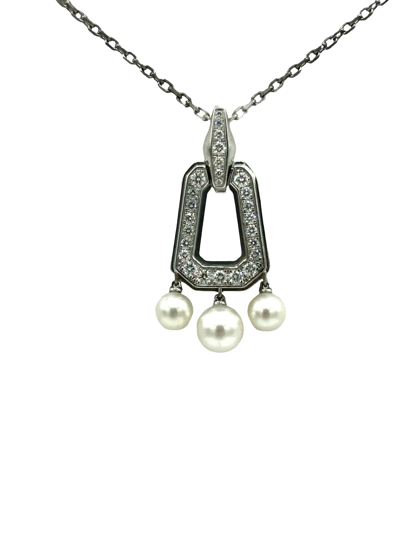 SKU: 320-86A simple yet elegant pendant necklace designed by Cartier. This is from the Cartier Chandra collection. The pendant necklace is made up in 18K white gold, containing 25 round brilliant cut Diamonds, with three Cultured Pearls suspended from the bottom. The Diamonds have a total weight of 0.75 carats. The pendant is on a 16″ open link chain. The pendant and chain are signed “Cartier”, stamped “750” and serialized “ON 8426”.