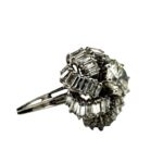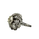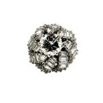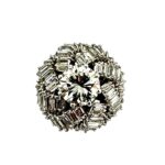 This beautifully unique ring features a 2.07 carat round brilliant natural Diamond surrounded by a domed swirl of baguette Diamonds with a total weight of 1.92 carats, set in 18K white gold. The center Diamond is graded by GIA as M color, VS1 clarity. The baguettes are graded as G/H color, VS clarity. The ring is made in all 18K white gold, and is currently a size 8.50. This can be adjusted as needed.