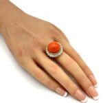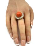 An exquisite Van Cleef & Arpels coral and diamond ring, showcasing the maison’s timeless elegance and refined craftsmanship. At its center sits a richly hued oval coral cabochon, prized for its vibrant, even coloration and luminous polish. The coral is framed by a graceful halo of brilliant-cut diamonds totaling approximately 2.06 carats, meticulously set to enhance sparkle and depth.
